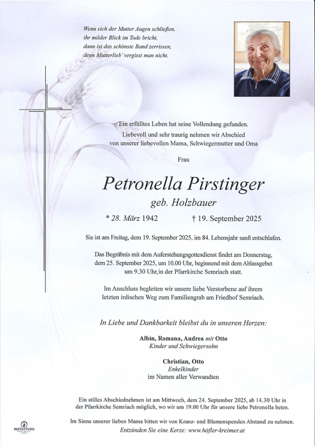 Aufrichtige Anteilnahme den Angehörigen. Abschied von einem geliebten Menschen, ist der Beginn der Erinnerung. Bewahrt sie in euren Herzen, die kann euch keiner nehmen. Für die nun folgende Zeit der tiefen Trauer wünschen wir viel Kraft, Zuversicht und Gottes tröstenden Beistand. In Verbundenheit Familie Marianne und Franz Puregger, Bestattung Semriach - Fam. Kreimer-Höfler