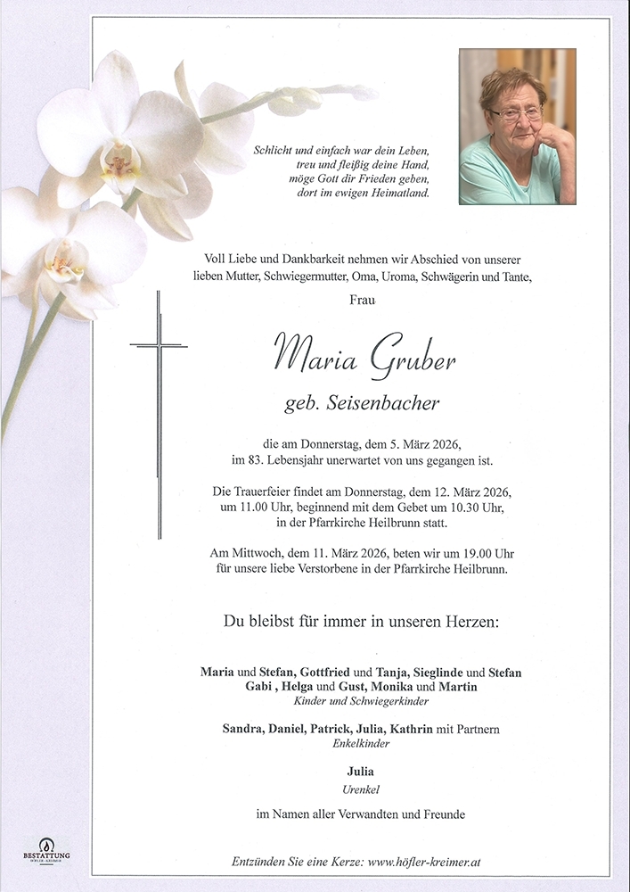 Ruhe in Frieden Maria , in lieber Erinnerung. Herzliches Beileid der Familie .Hildegard und Walter Weißenbacher