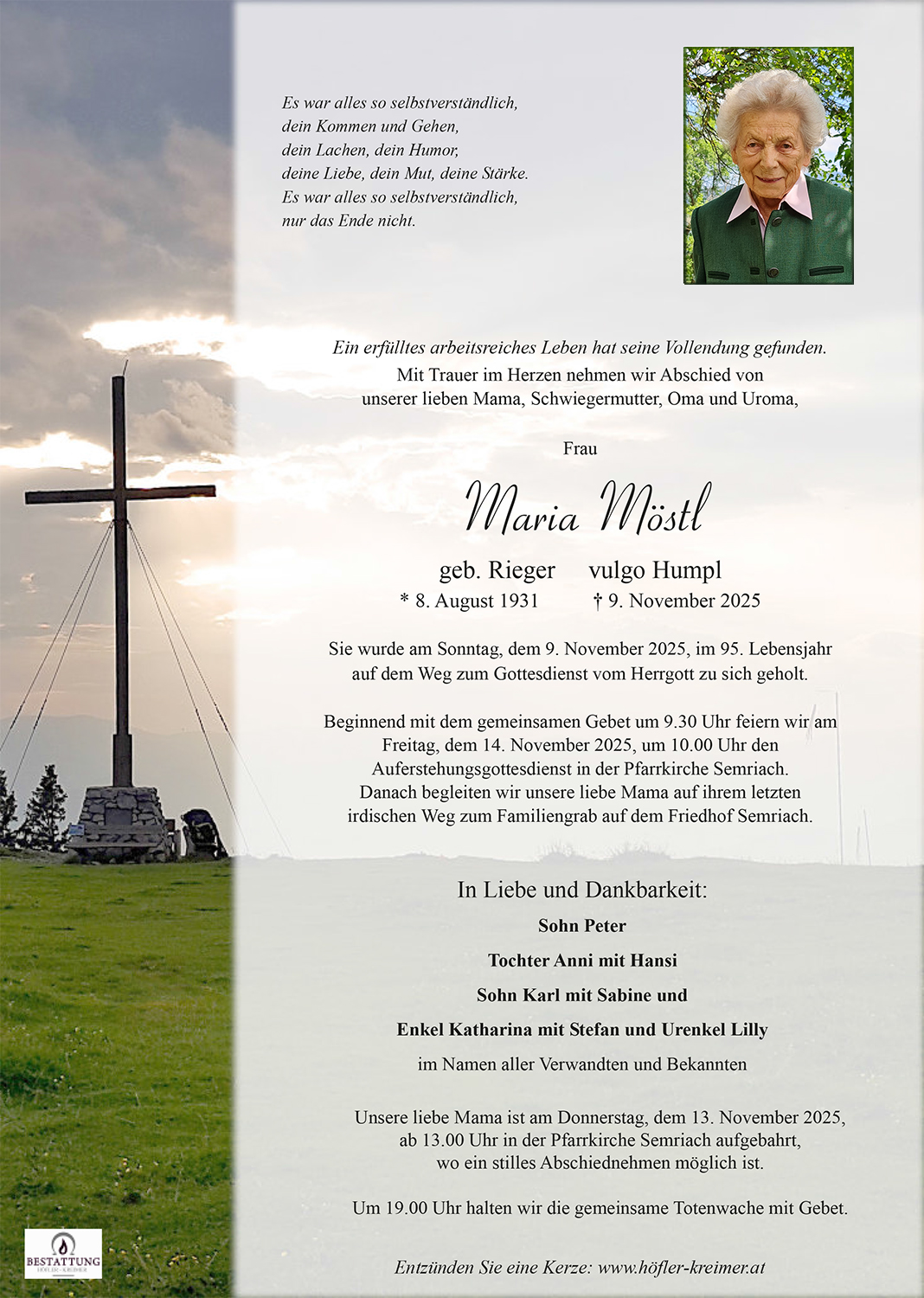 Liebe Trauerfamilie, in diesen Tagen fühlen wir mit euch und wünschen von Herzen, dass ihr die schönen, gemeinsam erlebten Begebenheiten in euer Gedächtnis rufen und daraus positive Energie holen könnt, die euch durch die dunkle Zeit der tiefen Trauer begleitet. Die Erinnerungen an eure Mama sollen euch Kraft geben ohne Wehmut an sie zu denken. Danke, dass wir euch in der schweren Zeit des Abschiednehmens begleiten dürfen. In Verbundenheit Marianne und Franz Puregger mit Familie - Bestattung Semriach Familie Kreimer-Höfler