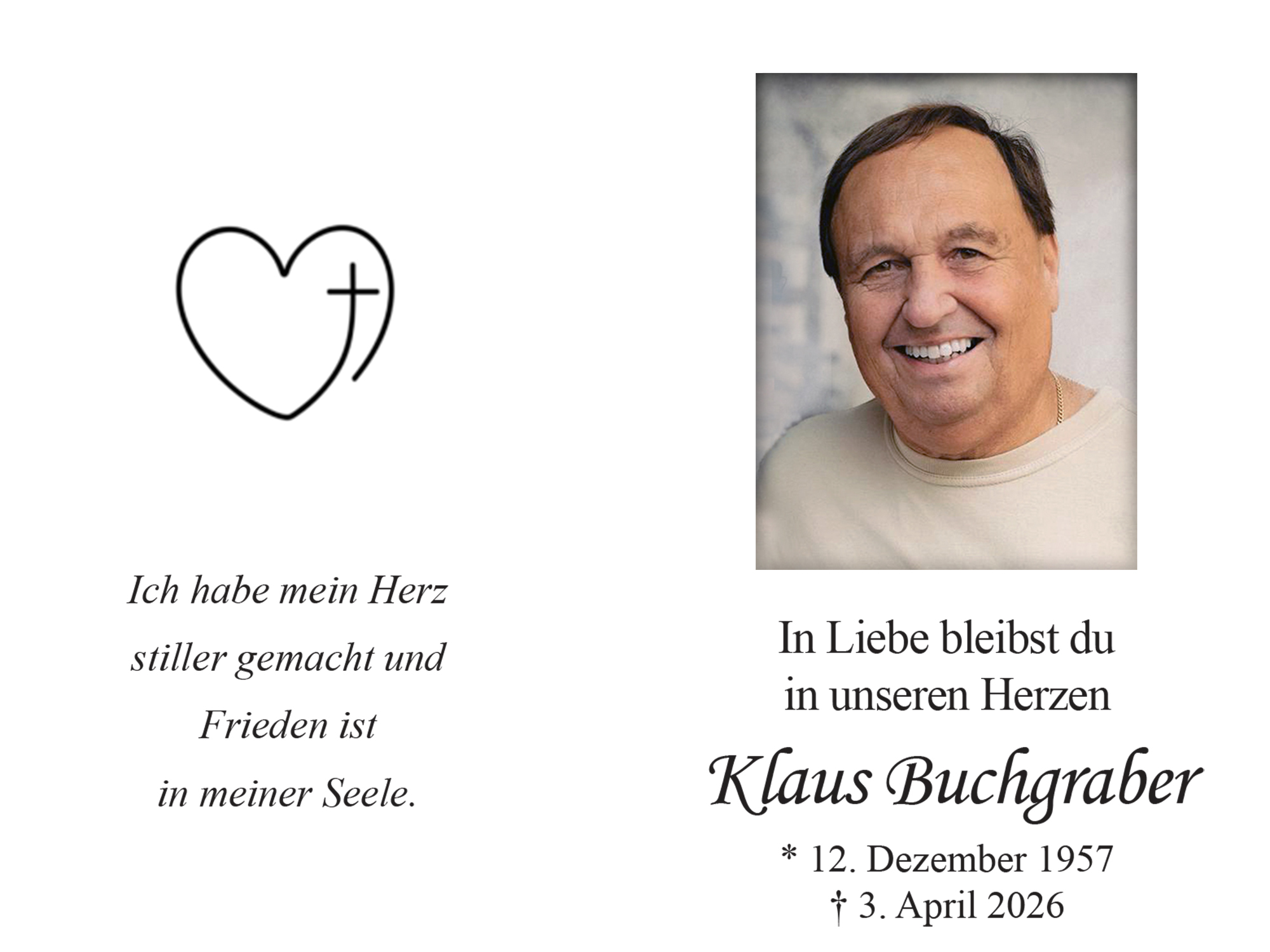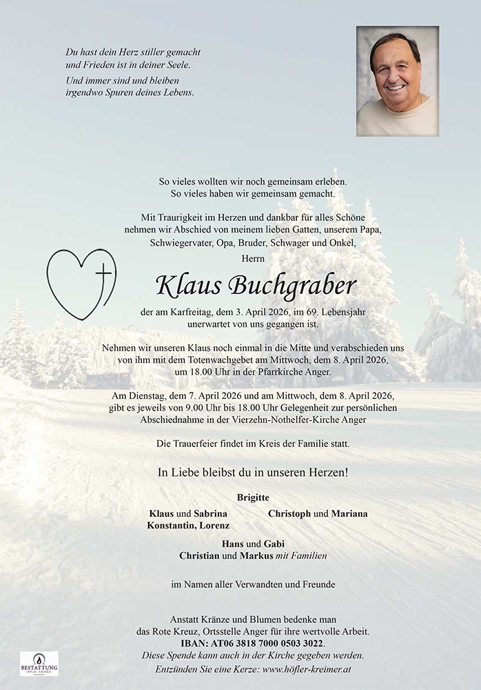 Lieber Klaus! Dieser Karfreitag war wohl ein ganz dunkler Moment, wo wir erfuhren, dass du nicht mehr unter uns bist. Ich danke dir für die vielen schönen Stunden, auch im Zuge der Zustellung des "TÄGLICHEN BROTES" wo wir immer kurz zusammen saßen und über verschiedene Themen gemeinsam lachten und plauderten. Möge viel Licht auf der anderen Seite des Weges dich begleiten. In ganz lieber Erinnerung Albert und Christiane